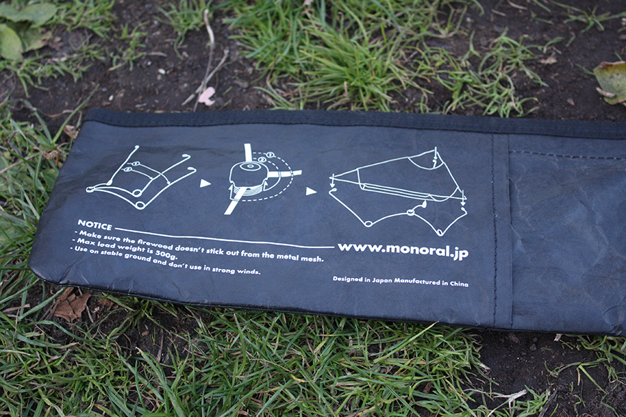 ということで軽量かつある程度の薪がくべられる焚き火台がないものかと探索していたところ、先日行われたBIKE & CAMPというイベントに参加した際「まさにコレ!」という商品に出会った。それがモノラル(MONORAL)の超軽量焚き火台「ワイヤーフレームフェザー」。まだ正式発売前だったが、このイベントで展示&先行販売していたのだ。モノラルの代表である角南さんにお話を聞いたところ本体重量は100gで、専用ケースに入れても130g以下らしい。しかもケースに入れた状態でぺったんこなので、フロントローダーでもサドルバッグでも隙間に突っ込んで持ち運べる。