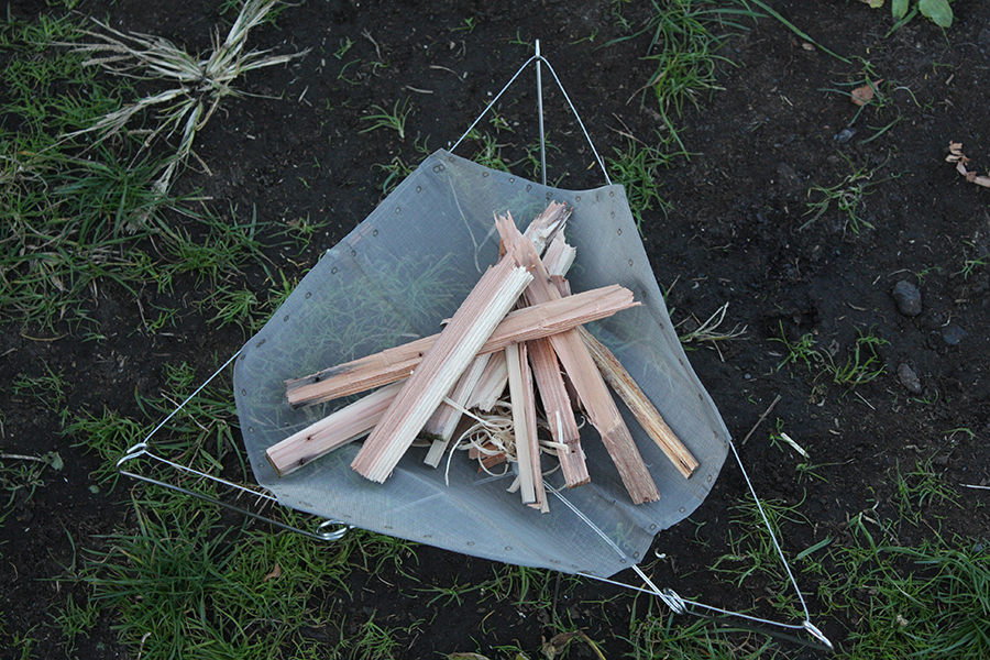 そこにチタンメッシュの火床をひっかけて完成。正三角形の焚き火台になる。簡単、しかも美しい形状。