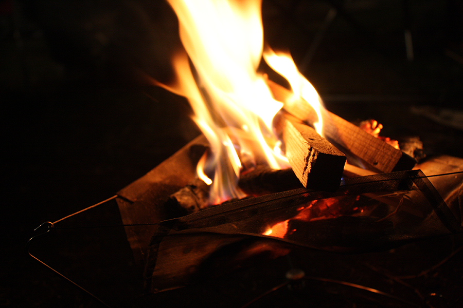 自転車でキャンプというと持っていくものも限られてしまうのだが、それでもキャンプの夜には焚き火がしたい。世に軽量な焚き火台は数あれど、やはりそこそこの重量になるし、かさばるものが多いのも事実。折り畳み式のネイチャーストーブならかさばることはないが、小枝を燃やすのが精一杯。それに用途が違う。ネイチャーストーブは小枝などを燃料に、お湯を沸かしたり、簡単な調理をするためのもの。しかし私にとっての焚き火の目的は、薪をくべてただただ火を眺めたい、そこに尽きるのである。もちろん暖をとるという目的もあるが、暖をとる必要のない真夏でも焚き火がしたいのだから、つまりそういうことだ。