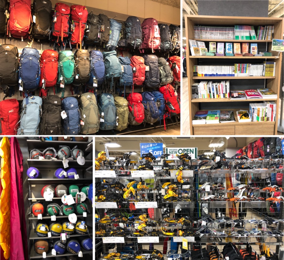 好日山荘は「登山・アウトドア用品専門店」です。さすがの品揃えに目が回りそう。用具好きにはたまらない空間です。書籍も充実。