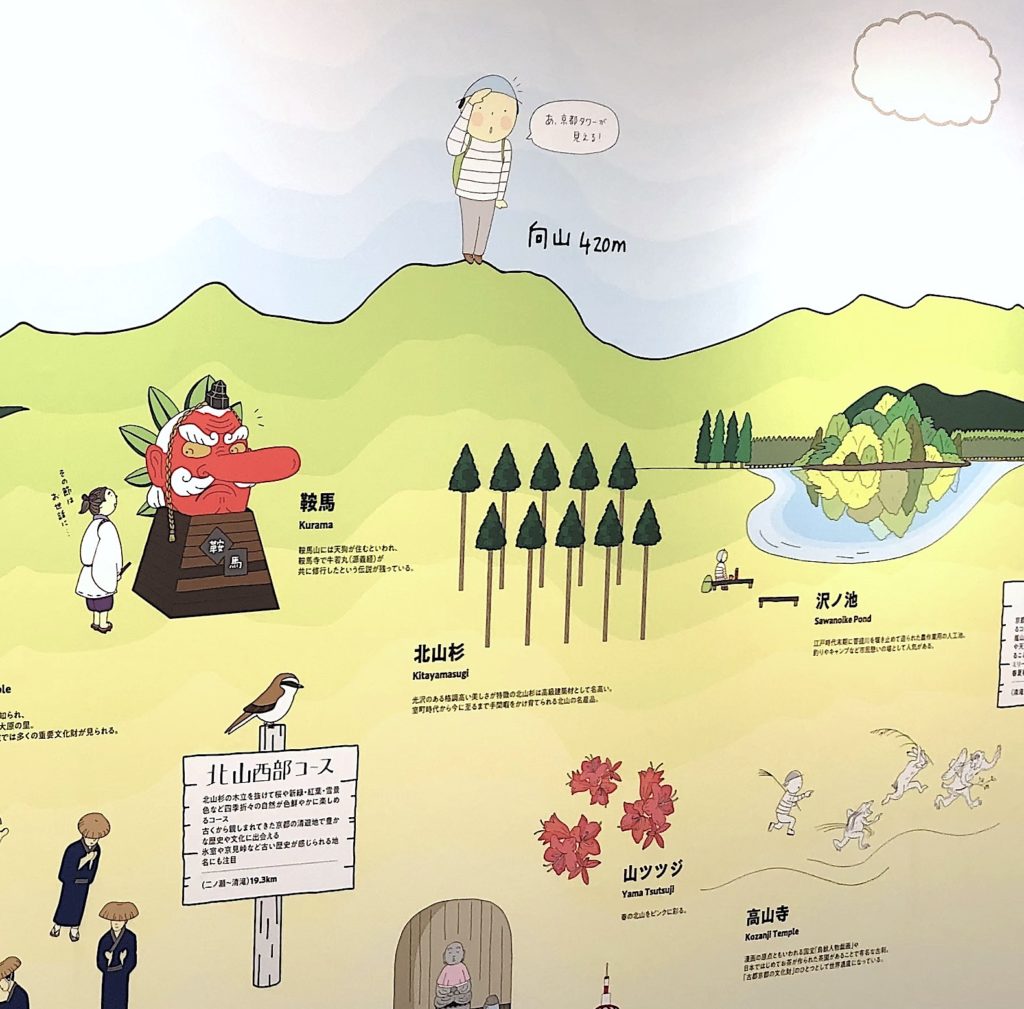そう、イラストレーターの鈴木みきさんが手掛けたものでした。京都だけに、壁に描かれているのは「京都一周トレイル」がテーマとなっており、そのサイズも圧巻ながら、細かく描かれている内容がまたほんわかとした雰囲気満載で、鈴木みきワールドが見事に展開されています。