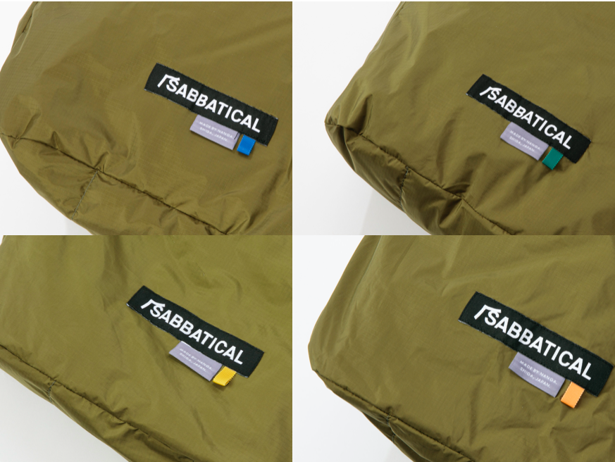 サバティカルのテントカラーにも合わせやすく、植物系のグリーンカラーを採用。全モデルとも統一されている。本体と収納バッグには、ダウン量を示した色別のカラーテープを縫い付けてあり、本体カラーは同じでも識別は簡単。青が350g、緑が450g、黄色が600g、オレンジが750g。