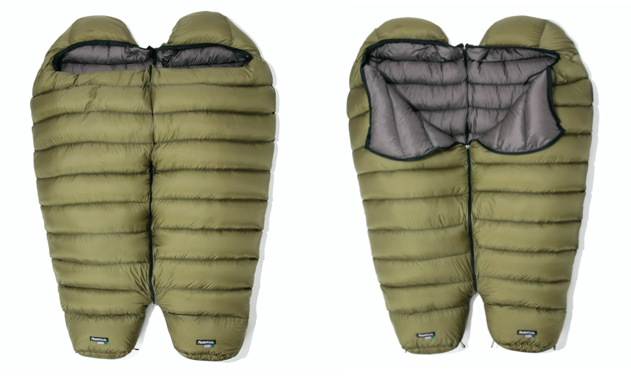 スリーピングバッグを左右に連結できるカップラーモデルも誕生。子どもが小さいころなら親子3人でも、またはカップル同士で眠ることもできる。ひとつずつ購入するよりも価格が抑えられており、コストパフォーマンスもよい。コレ、かなりお買い得である。