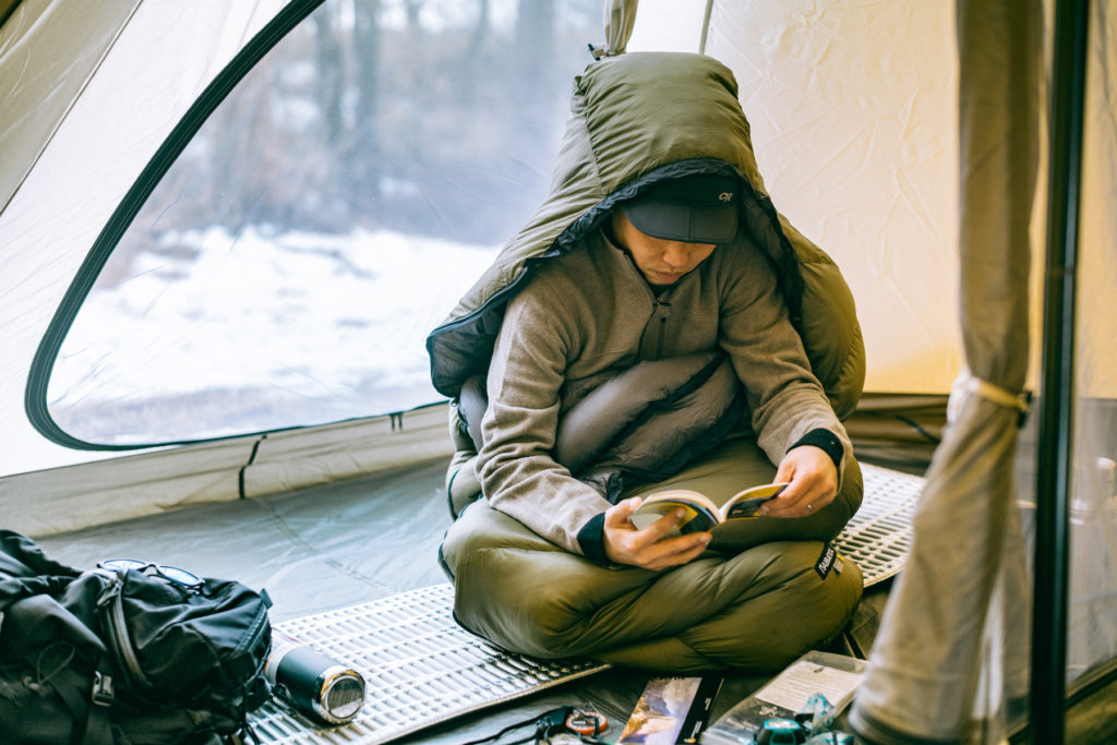 実際の使用時の使いやすさを追求し、保温性と快適性のバランスを考えながら身体の動きをさまたげないカッティングに。寝返りもしやすく、スリーピングバッグに入ったままでもあぐらを組むことさえできる。