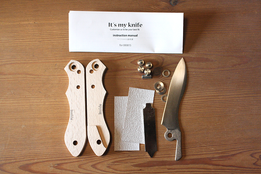 説明書、外形が切り出されたブナ材のハンドル、サンドペーパー#120、#240各1枚、ネジ類、板ドライバー、ブレード(両刃三層割り込み・芯材:安来鋼青紙二号・外層:ステンレス)
