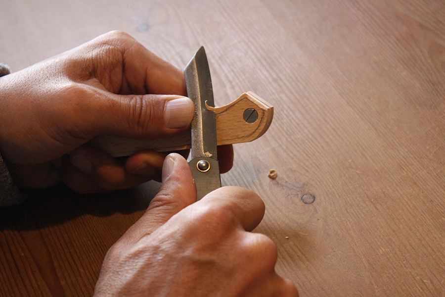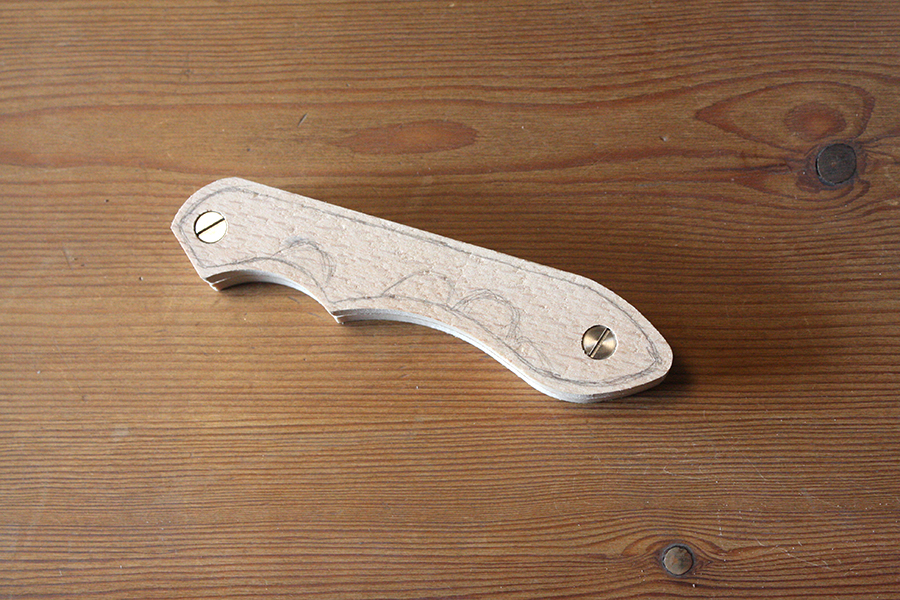 ハンドルのフォルムはすでに切り出してあるので、角を少しずつ落としながら自分好みの丸さに仕上げていけばいいだけだ。まずは、ブレードを装着しない状態で仮止めし、板に削り落とす目安の線を鉛筆で描いていく。