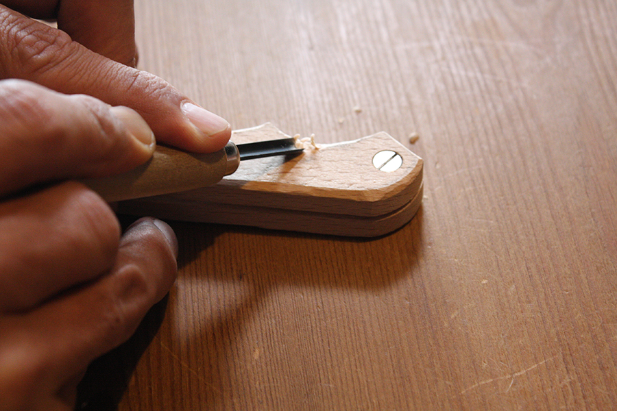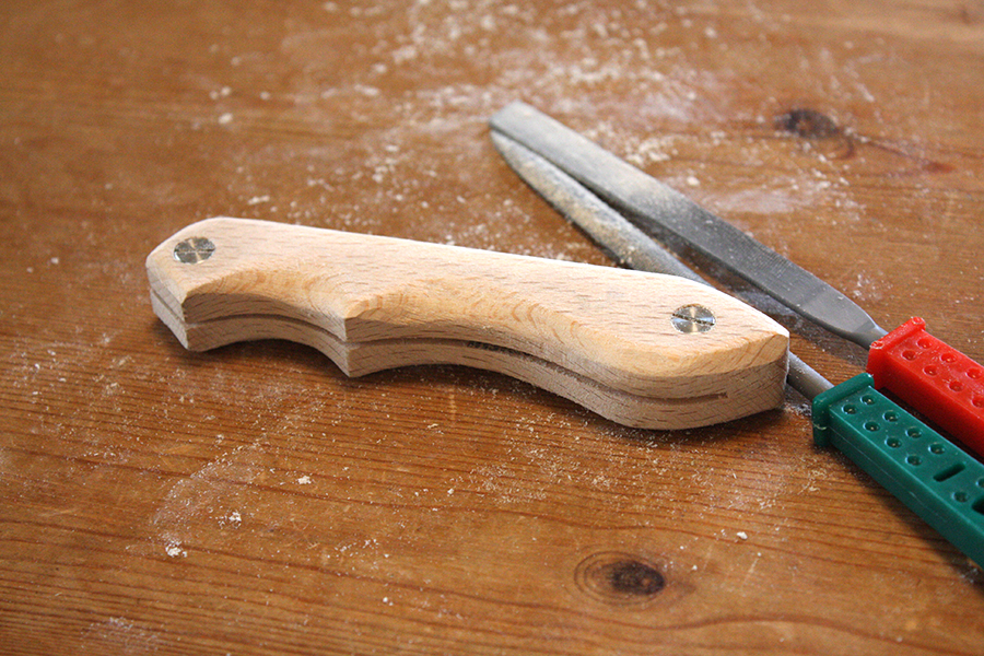肥後守と彫刻刀で粗く削ったところを各種ヤスリで仕上げていく。面を均一にしたいところは平ヤスリで、曲面は丸ヤスリで削りながら整えていく。