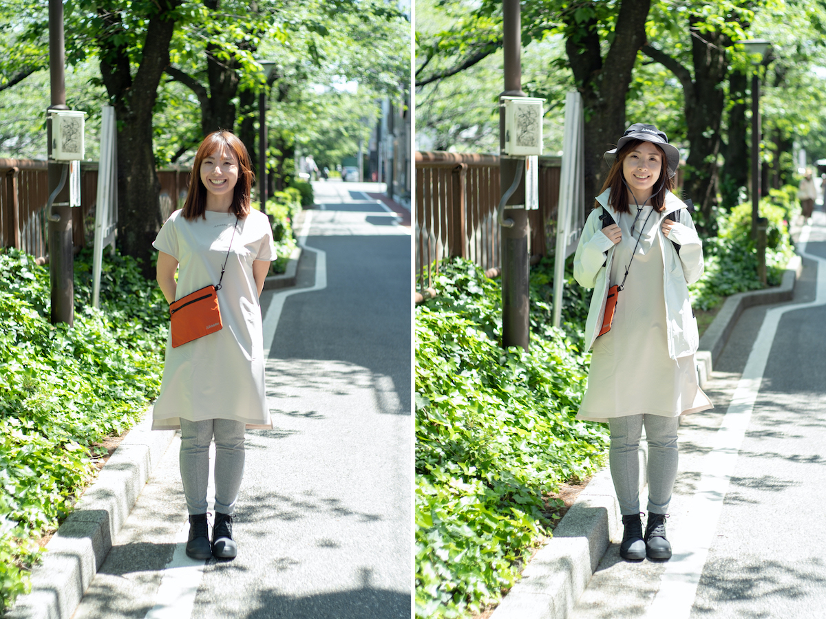 あみさんが実際に着用した写真がこちら。左が街中スタイルで、右が山スタイルとなる。