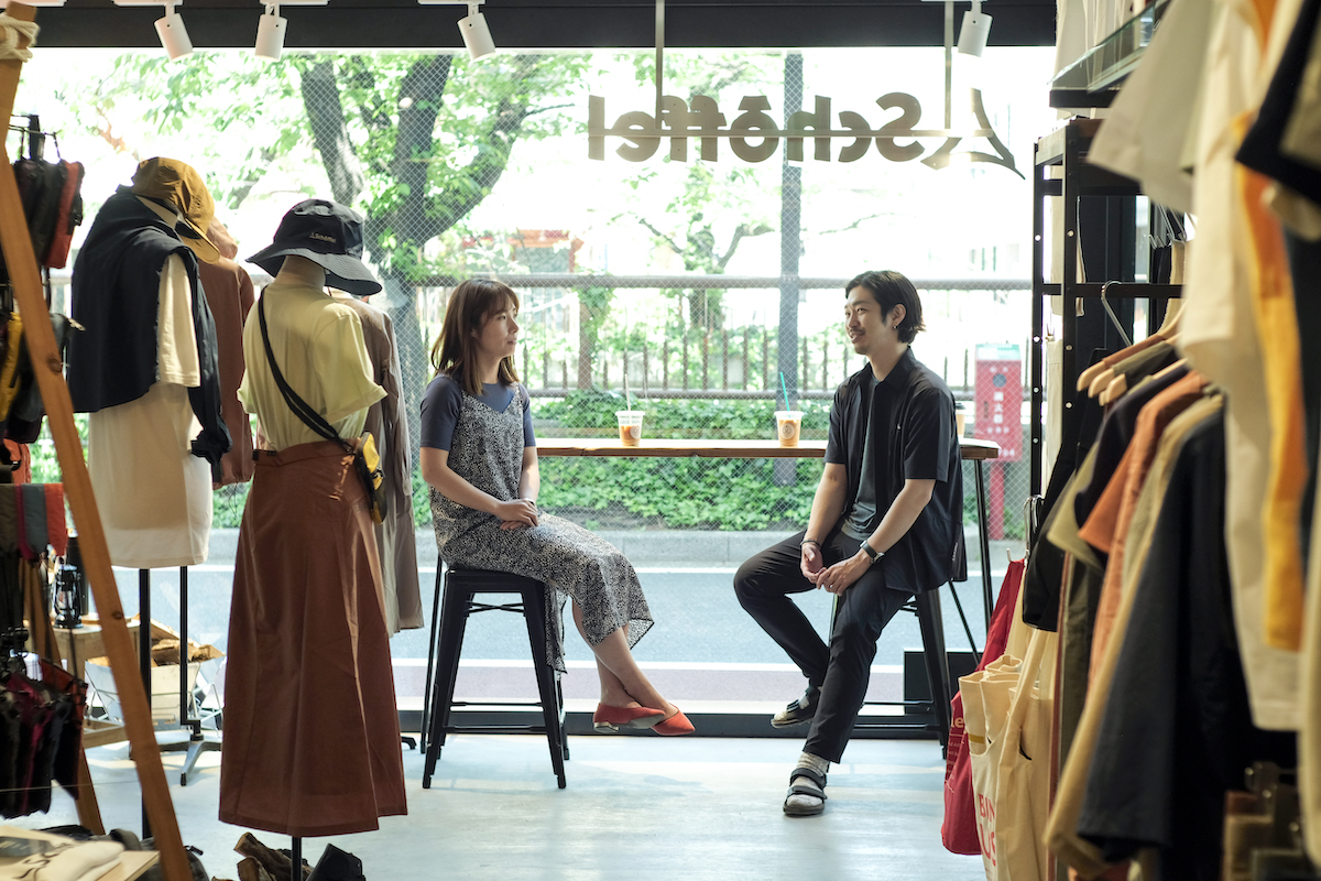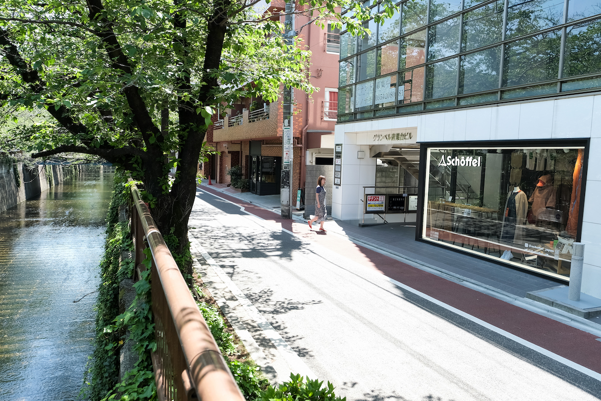 普段から登山などのアウトドアに親しむ “あみ” さんとショッフェル中目黒店へ。店の目の前を流れる目黒川沿いの桜並木は少し歩くだけで気持ちがいい。都内の立地でも自然を感じられるロケーションが、ショッフェルの掲げるブランドメッセージ「Ich bin raus.(イッヒビンラウス)── 外へ出よう、自然のなかへ」と相まって、高揚感がある。