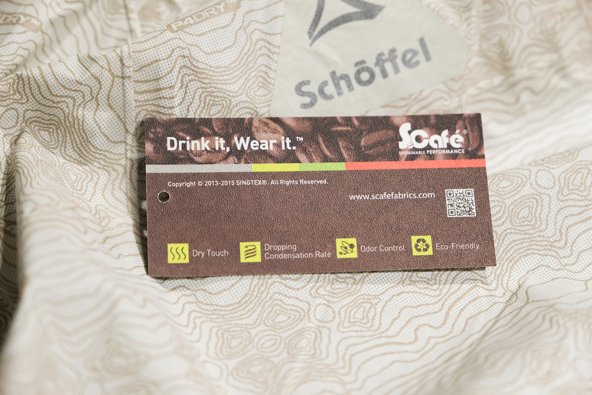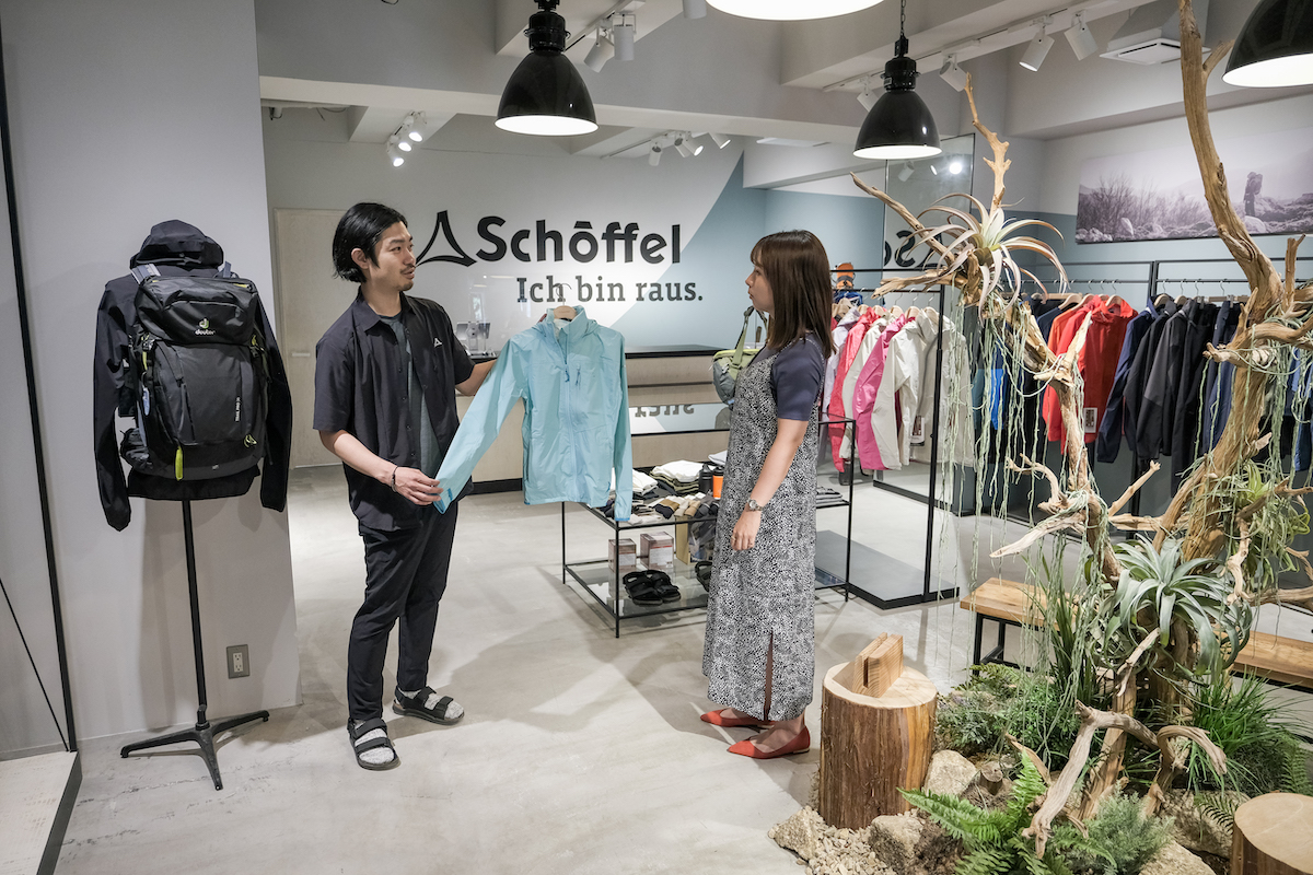 いえ、じつは200年以上もの歴史があるドイツのアウトドアブランドなんですよ。日本でいえば江戸時代かな。ブランド名は創業者ゲオルグ・ショッフェルのファミリーネームで、創業から現在までずっと家族経営で運営しています。身近な自然とのふれあいを大切にし、環境にも配慮しています。たとえばこのレインウェアは裏地に「S-cafe」という使い終わったコーヒー殻のリサイクル素材が使用されているんですよ。