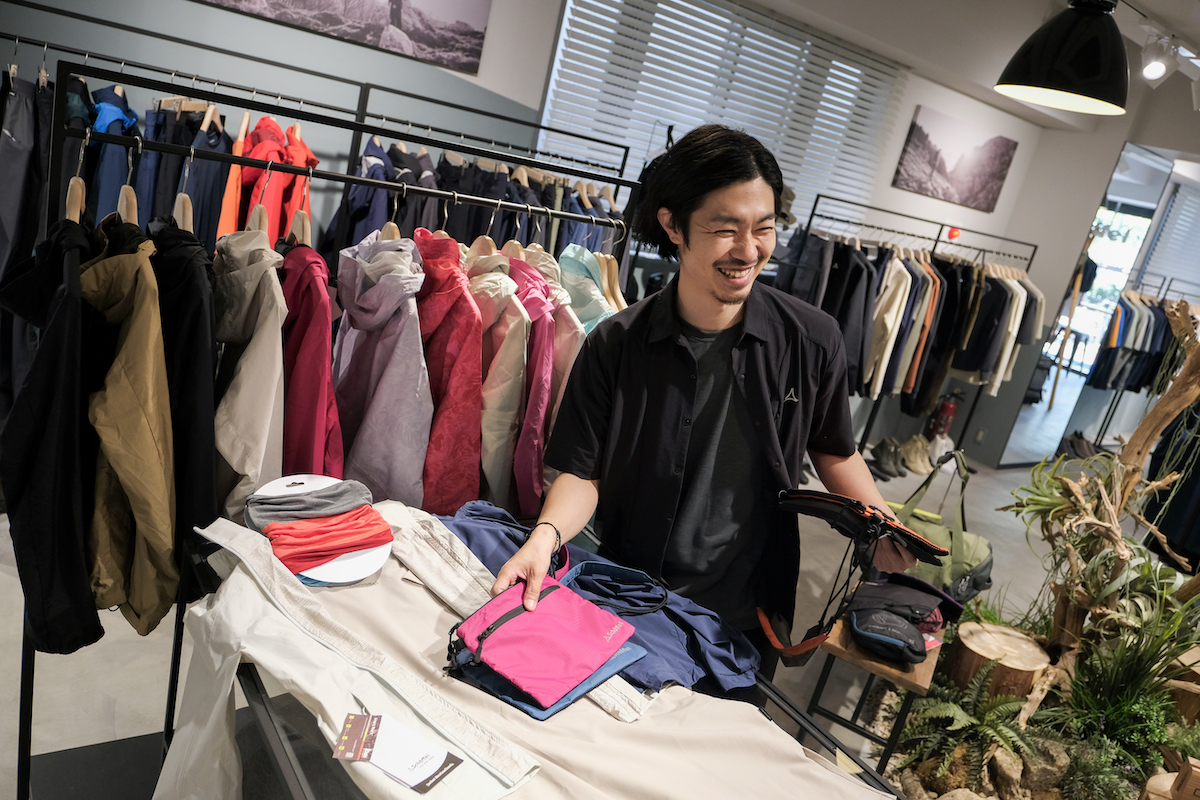 普段から登山などアウトドアに親しむあみさん。登山用のウェアやバックパックなど、ひと通りは持っているそう。はたして惹かれる製品はあるのだろうか。ところどころ製品を見渡しながら奥へ行くと、店長の嶋田さんが挨拶に来てくれた。