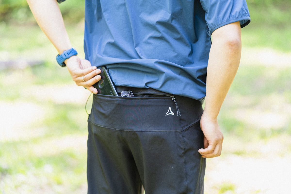 ヒップのポケットはサイクルパンツのように横長。浅めなので座っても小物が当たらない。