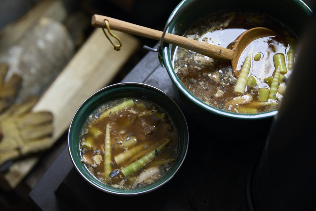 このパイオニアキャンプセットは、焚き火を中心に暮らすキャンプシーンを想定してつくられたクッキングツールだという。ならば、山の生活にマッチしないわけがない。
