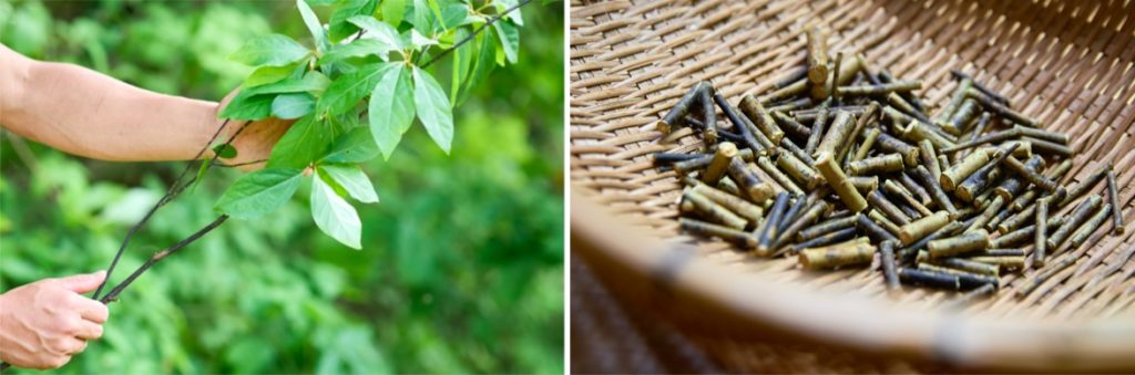 採ってきたクロモジをタワシでゴシゴシ水洗いし、名前の由来となる黒い斑点を落とす。細い枝の部分をハサミでカットし、2週間天日干しにする。