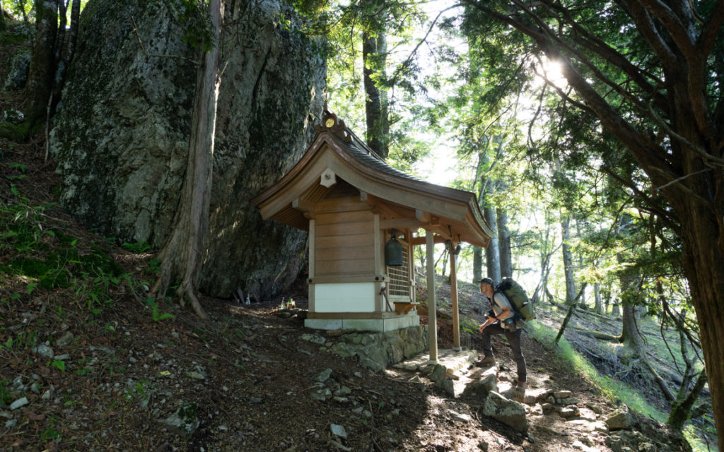 「低山トラベラー」そして「山旅文筆家」をみずから名乗る、大内 征さん。この肩書きは果たして、どのようにして生まれてきたのだろう。そのルーツを探るべく、大内さんの低山探究の原点ともいえる東京の深山へ。テント泊での2日間、奥多摩・七ツ石山への山行に編集部も同行した。写真は七ツ石山の山頂直下にある七ツ石神社。オオカミ信仰と平将門の伝承が残る古社である。