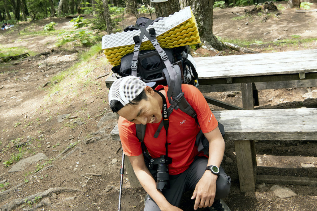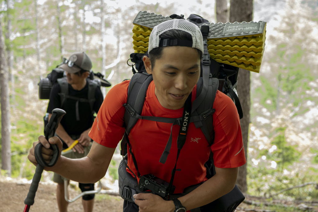 山小屋従業員として鍛え上げられた歩荷力をフルに発揮! 荷物を背負ったまま撮影する余裕も。