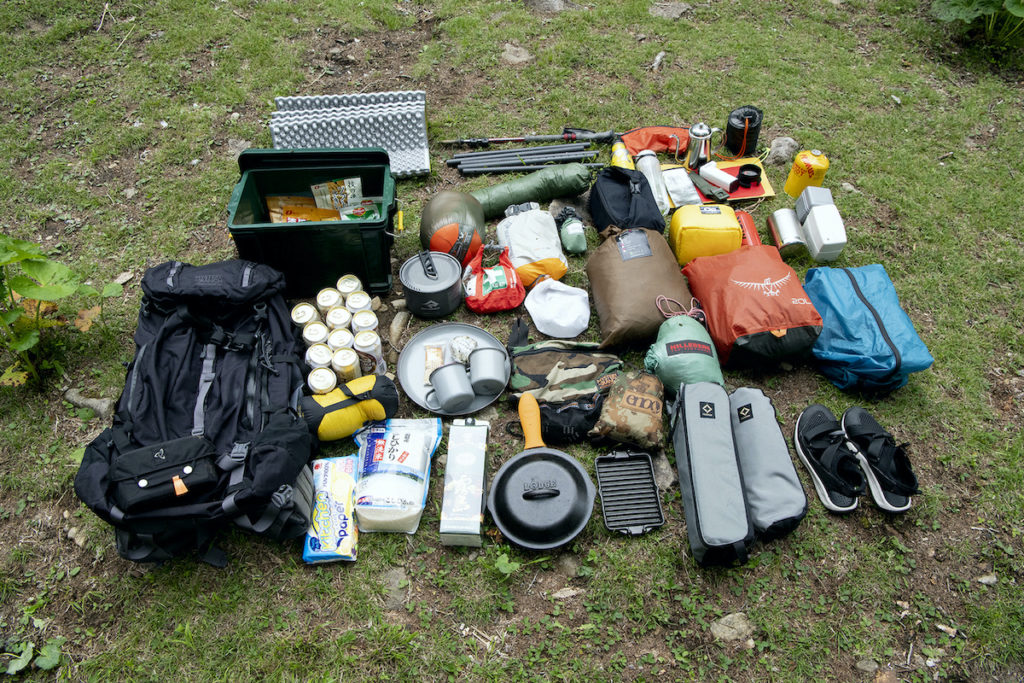テントにタープ、ハンモックテントに食料。スキレットがあるうえに、グリル用の鉄板も!? この日の総重量は40kg弱。