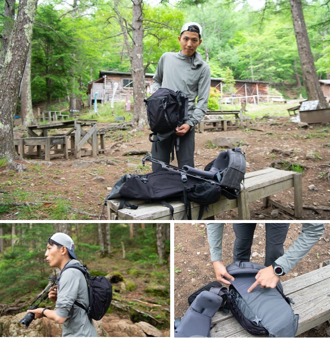 綾井さんはそのタフさ、積載能力の高さからミステリーランチに惹かれたが、背負うほどに目を見開かされるのは、快適な背負い心地でありフィット感の高さだという。この快適さこそがミステリーランチの本懐。スライド式のヨークを採用し、パック本体とメインフレーム(荷重伝達システム)を別に構築することで、理想的な収納と万人に合うフィット感の高さを両立。その思想は大型パックだけでなく、アレンジとして使うアタックパックにも注がれており、上質なデイパックのようなフィット感を誇っている。