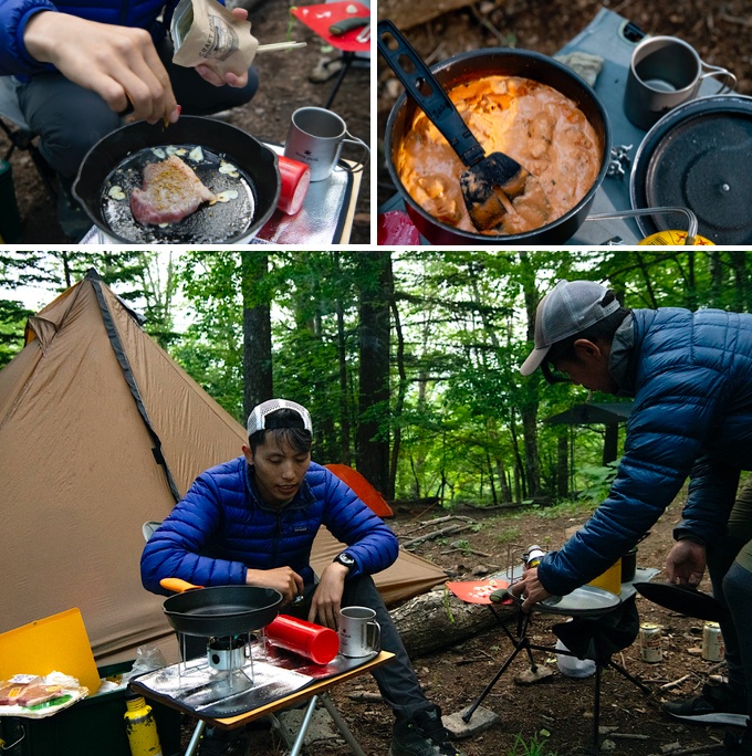 そうして、富士見平小屋のキャンプサイトへと戻ってきた。綾井さんはステーキを焼き、中込さんはELKのヒット商品であるというSPACE SPICEのカレーを振る舞ってくださった。星空のもとビールを飲み、旅の話を聞く。今回は1泊のため、瑞牆山にしか登れなかったが、オーバーロード機能を活かしたBCキャンプシステムであれば、数泊して小川山や金峰山をめざしてもよい。それを北アルプスの涸沢で、雷鳥沢でと考えてゆくと、楽しみが広がってゆく。