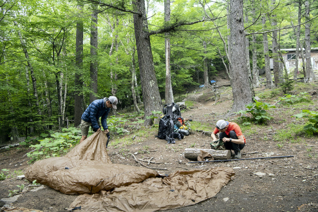 仲よく宴会用のワンポールテントを設営するふたり。イベントやプライベートでも山行をともにするそうで、息はぴったり。