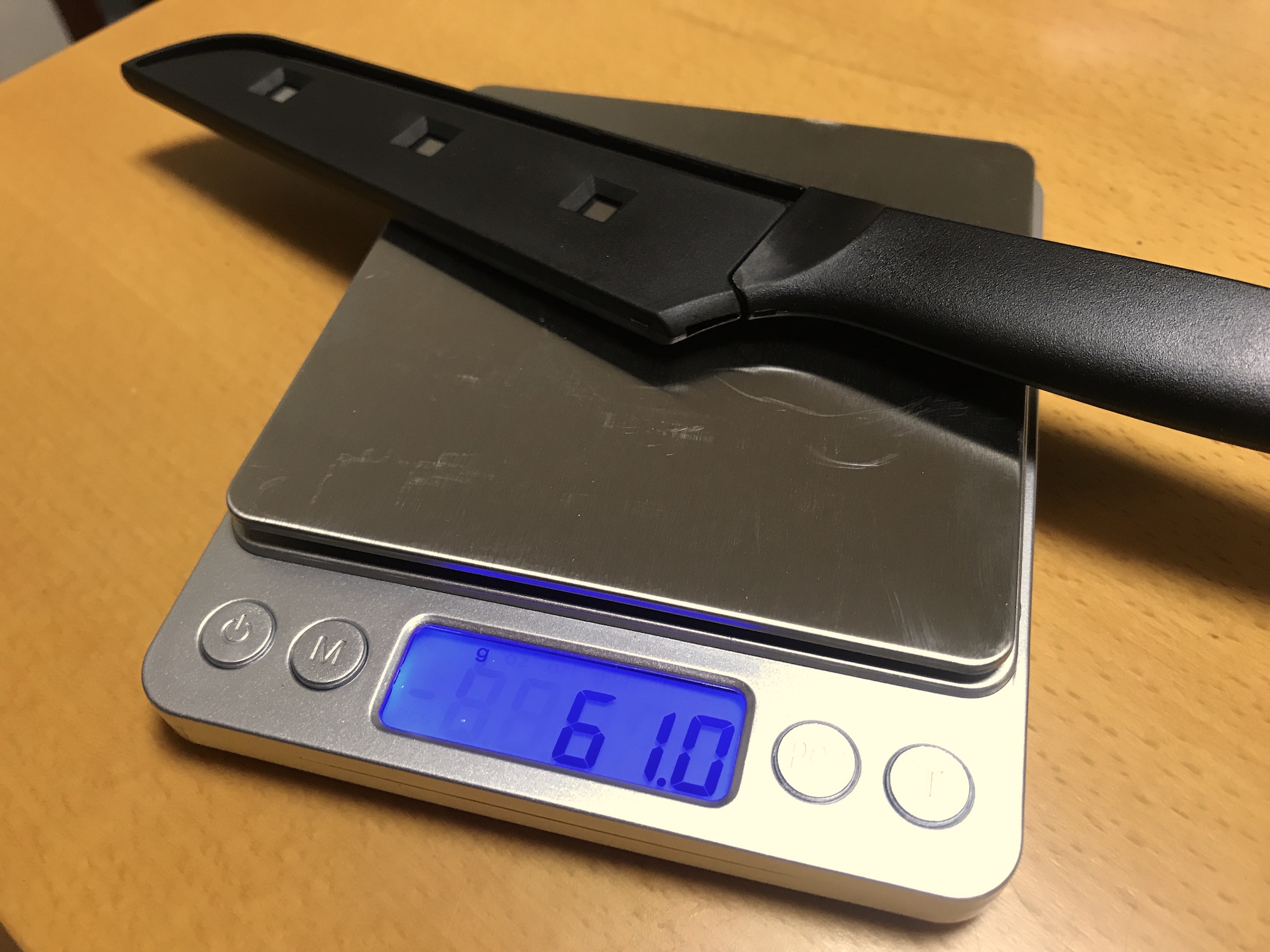 家に戻ってさっそく孫六を実測する。重量は61g。刃渡りは12cm。刃の厚みは1.5mmほど。これはよく切れそうだ。