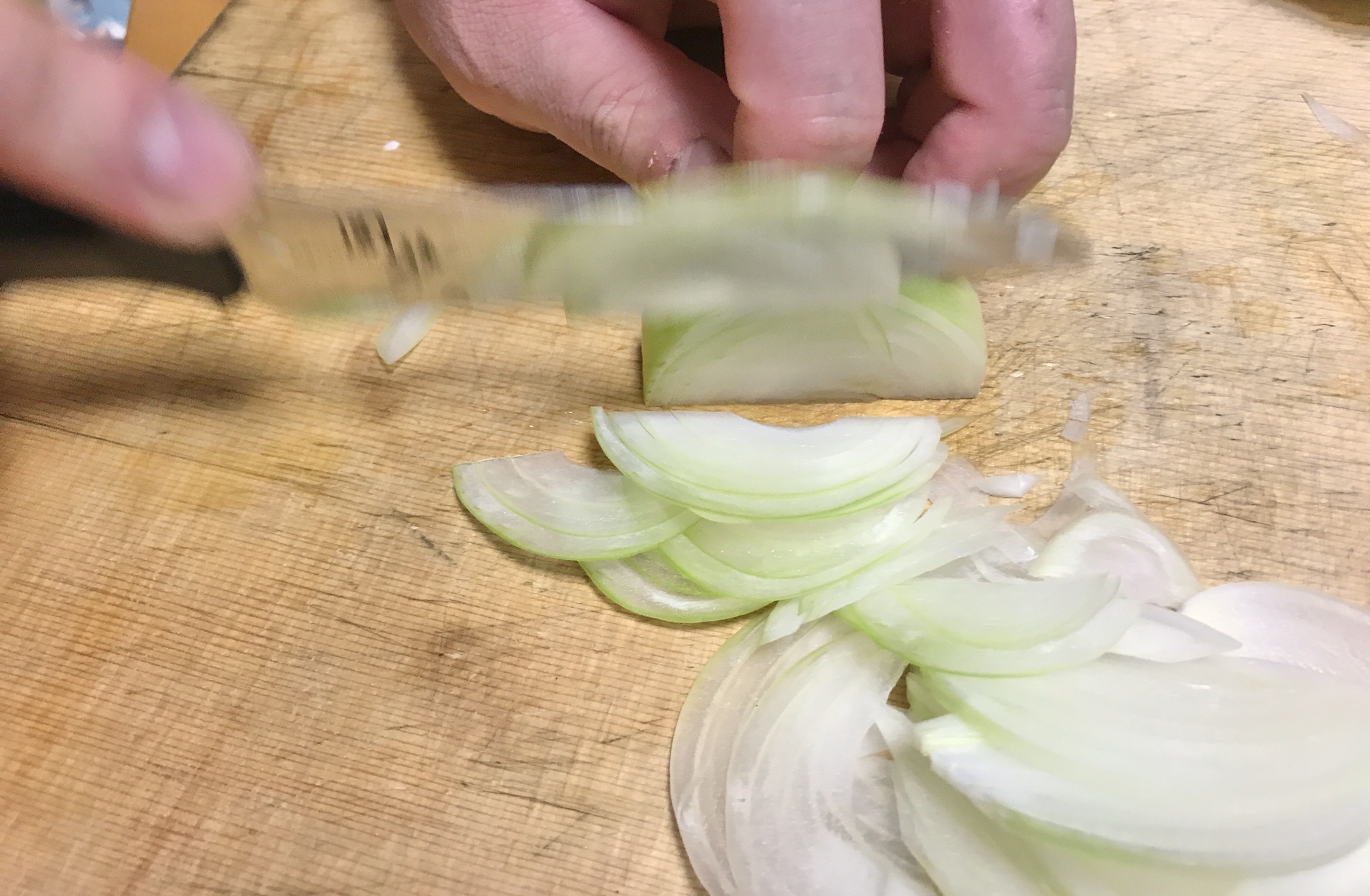 台所にあったタマネギを切ってみる。予想した通り、刃が薄いのでスタスタと刻める。繊維をつぶさないので目も痛くない。