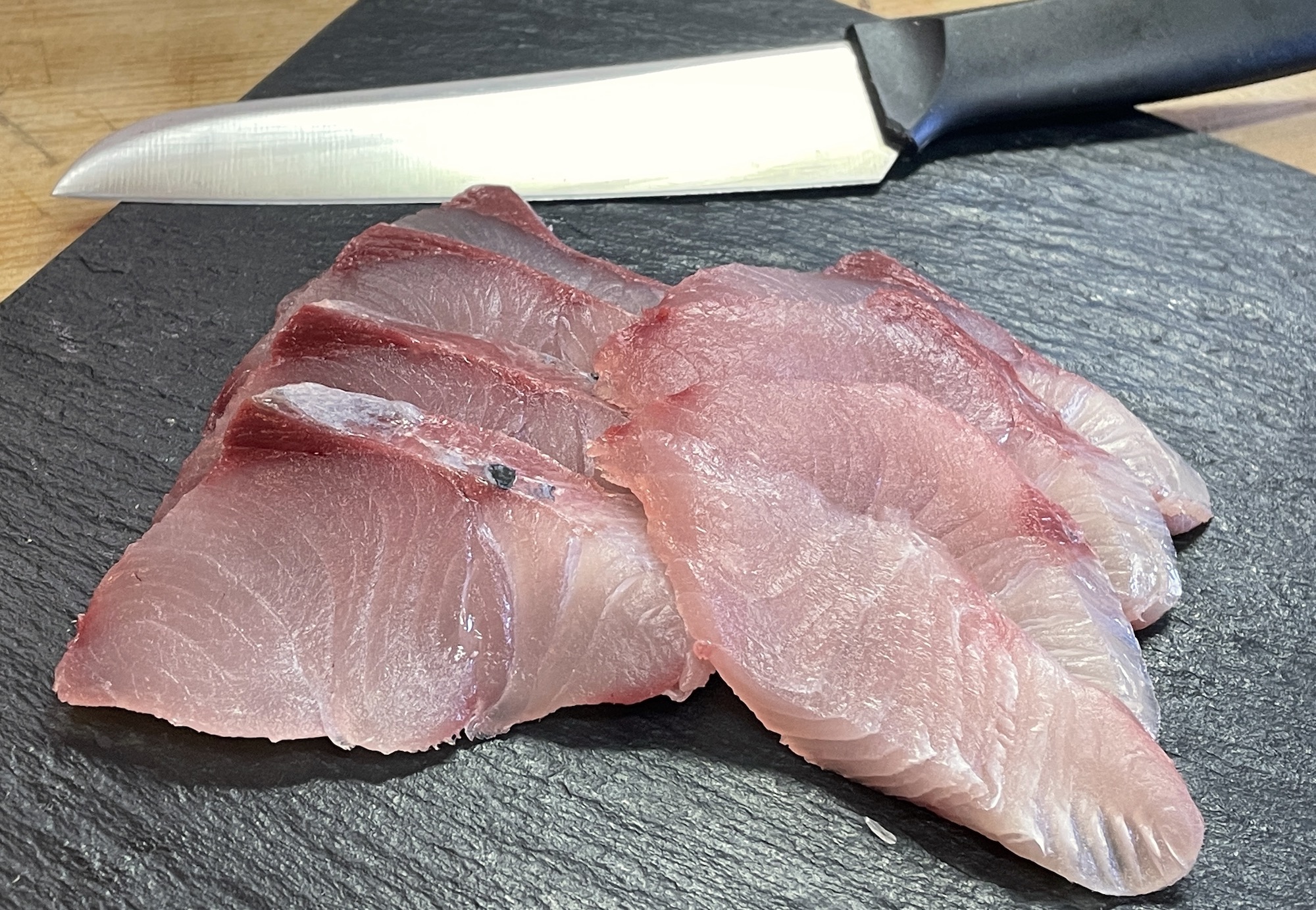 皮を引き、サクから刺身を切り出してみる。ピッと角の立った切り身がつくれた。刃の厚いナイフではこうはいかない。