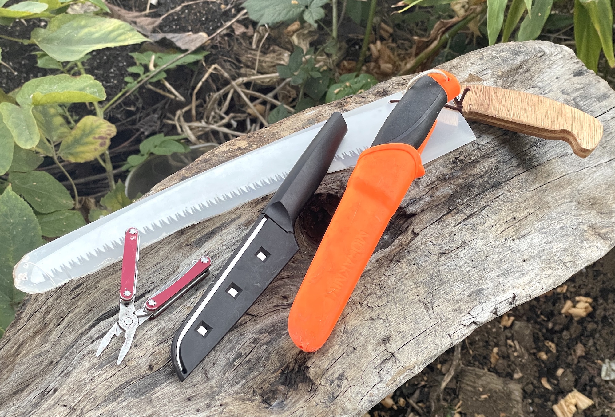 写真は孫六を加えたお出かけ刃物セット。薪を作る鋸。雑多な活動に使うナイフ。道具の補修や調整に欠かせないプライヤー。これらと包丁を合わせた総重量は364gだ。「作業性に対する重量」の点ではバランスがよいと思う。