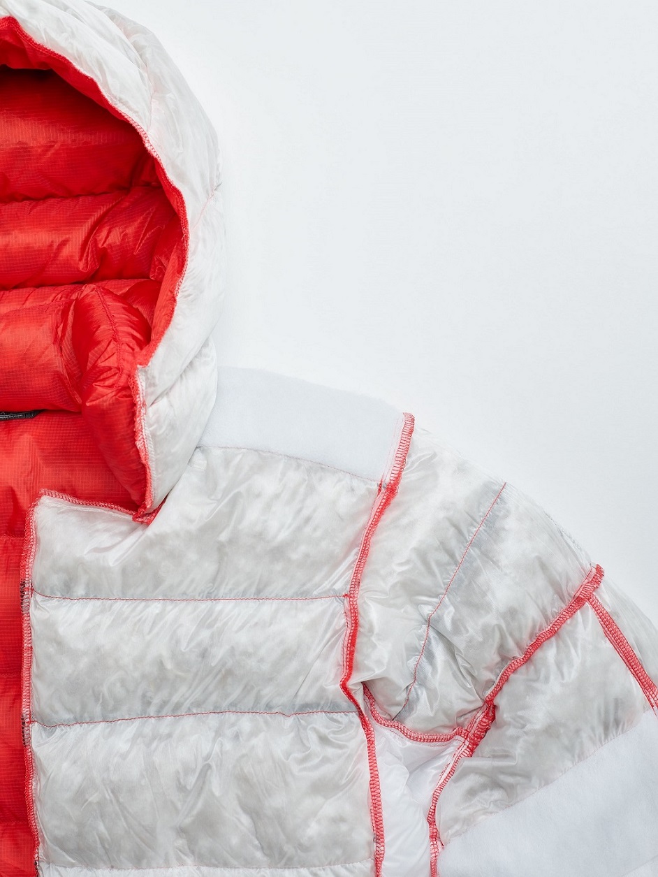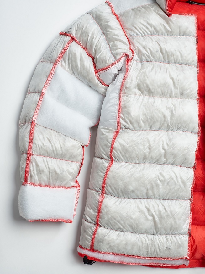 保温性の確保にもアークテリクスの技術とこだわりが感じられる。ダウンコンポジットマッピングという設計方法で、ダウンと化繊を戦略的に配置しているのが特徴だ。袖口や脇下、肩や肘の内側といった、汗などの湿気の影響を受けやすい箇所には、撥水加工により湿気に強い化繊中綿「コアロフト™️」を採用し通気性を確保している。ダウン部分は850フィルパワーのヨーロッパ製グースダウンを使用しており、軽くてあたたかい。