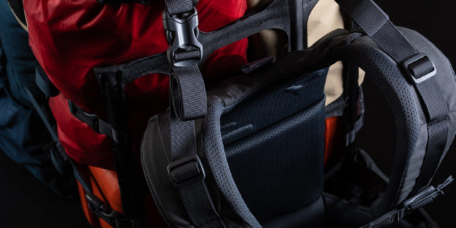 次に、オーバーロード機能です。もちろんオーバーロード機能がいちばんいいんですけども、ここにTVカメラの三脚を挟むことによって、重心を真ん中に持ってくることができます。ふつうのモデルだと、横のほうに三脚を縦に留めることしかできなかったのですが、このミステリーランチなら真ん中に持ってくることができるので、体がブレることなくまっすぐ歩けるようになりました。重心位置が安定している。それが歩荷のシーンでは、いちばん助かるといったところです。
