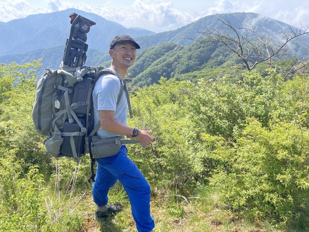 ミステリーランチのマーシャルに出会ってからは、こんな大きくて重い三脚もなんの心配もなく担げるようになった。安定感と安心感が半端なく、思わず余裕の笑顔にもなる。