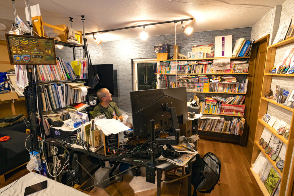 ヘリコプター好き、アニメ好き、用具好き……さまざまな好きが生まれる齊藤大乗の秘密基地。マニアならではの資料に埋もれた彼らしい部屋の佇まいである。