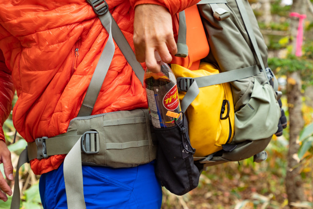 分厚いヒップベルトには、なんでも引っ掛けられるようにウェビングが縫い付けられている。ここに写真のようにボトルホルダーを付けることもできるし、ポーチを取り付けたりもできる。ミステリーランチにも専用のアクセサリーがたくさんあるので、いろいろと試してみるといい。もちろん、自分自身で工夫してみることもオススメしたい。