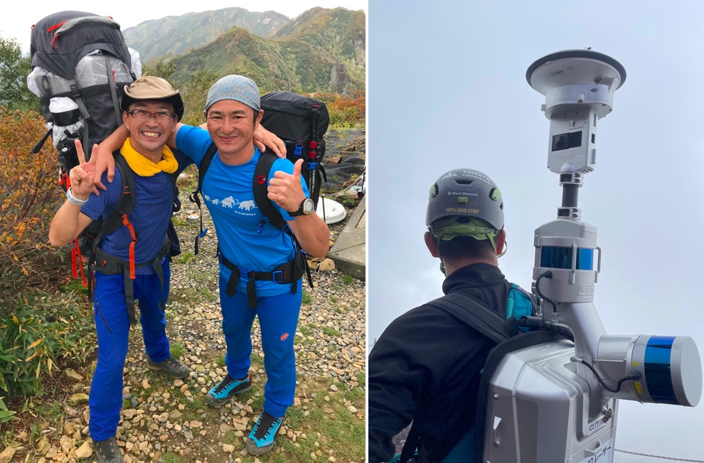 左は歩荷仕事を始めたころの写真。苦楽をともにする歩荷仲間と。右は、3Dスキャン用の特殊な道具。
