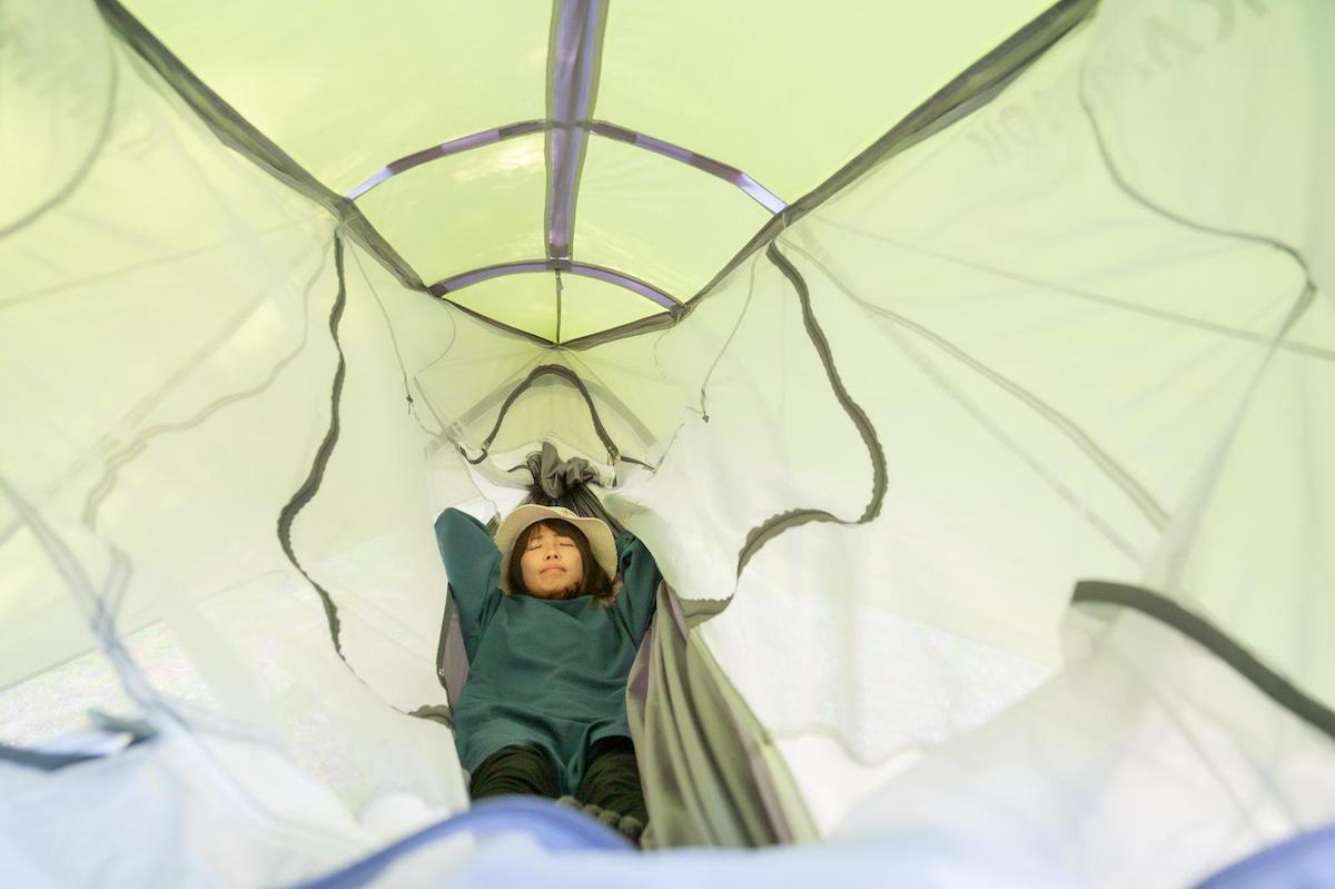 また、頭側・足側だけでなく左右もまくり上げ、開けておくことができるので、風の通りがよくてとても気持ちがいい。ここまで閉鎖的な空間だと蒸れるのではないかと心配したが、しっかりと風が通るので、じめっとした季節でも活躍するだろう。