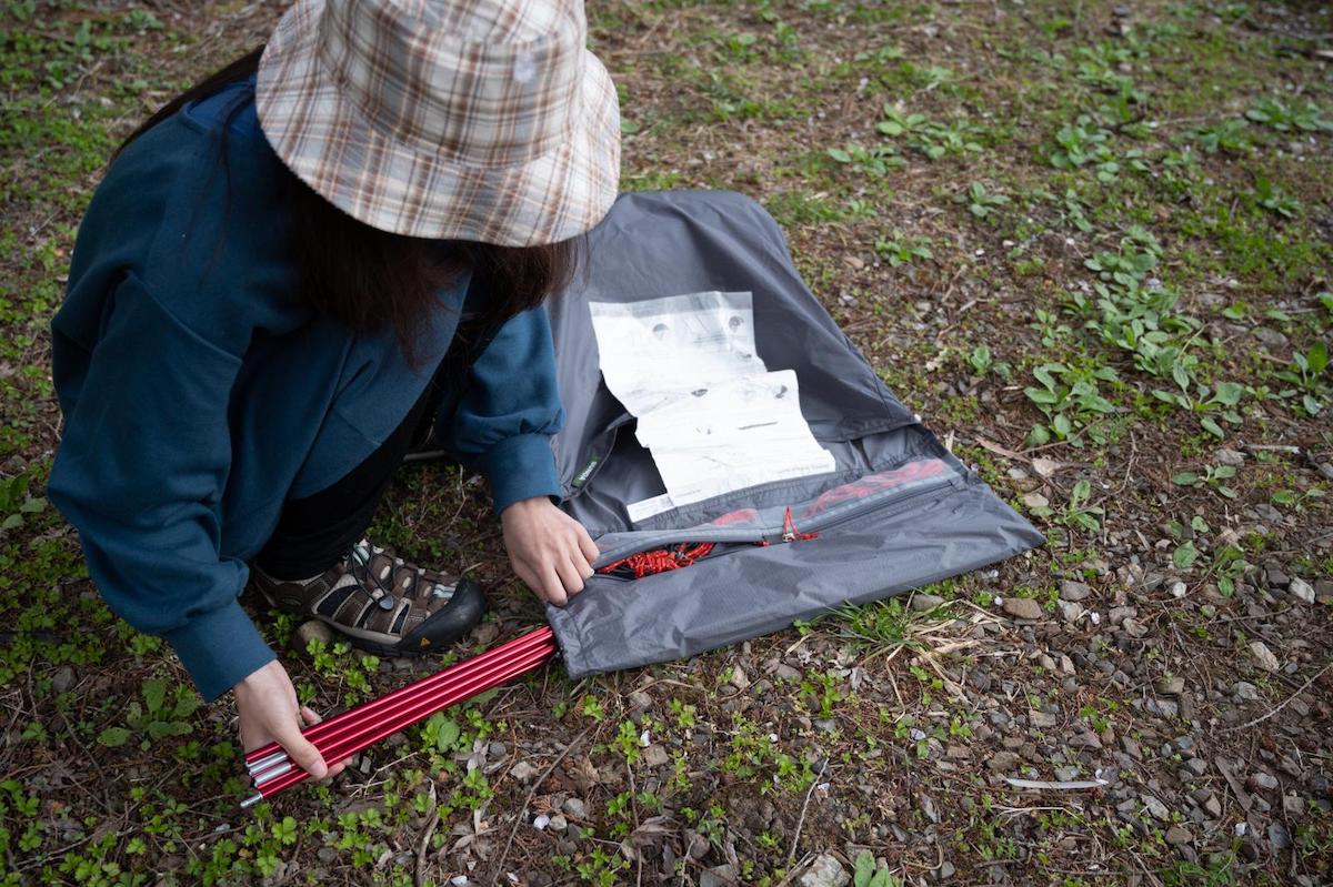 設営はふつうの自立式テントの要領とほぼ同じで、本体のスリーブにポールを通すことが主だ。まずは左右のアーチになっている箇所を仕上げ、そのあと左右をつなぐ長いポールを貫通させる。そして天井のいちばん高くなる部分を短いポールで広げる。