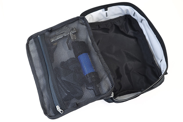 バックパック内にデッドスペースが出来ないよう、形状は「弁当箱型」。開口部はダブルファスナーで蓋を全面的に開けられるので、小物からウェアまで出し入れがしやすい。蓋の内側はメッシュポケットになっており、どんな小物が入っているか一目瞭然だ。