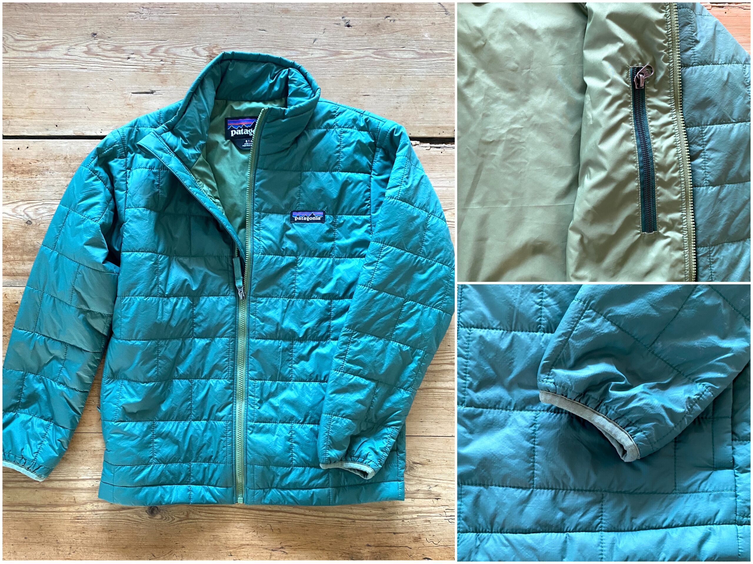 左)キッズ・ナノ・パフ・ブリック・キルト・ジャケット。キッズは今シーズンは4色展開。右上)裏地は滑りがよくベースレイヤーの上に重ね着しやすい。裏側にチェストポケットも。右下)シェル素材はリサイクルされた漁網を使用し海洋プラスチック汚染問題に貢献