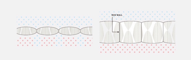 おわかりでしょうか。左が一般的な「ステッチスルー構造」。表地と裏地とを一度に縫い合わせています。このため、縫い目の部分ではダウンの厚みがゼロ、という事態が起こり、ここから冷気が侵入してしまいます。一方、右の「ボックスウォール構造」はどこをとってもロフトふかふか。ダウンの厚みも均等に広がって保温力バッチリ。冷気をシャットアウトし、快適な暖かさを保つことができます
