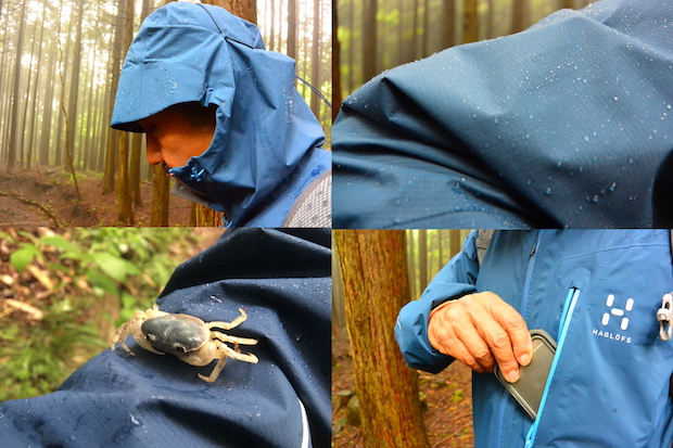 左上)フードの大きさは小さすぎず大きすぎず、視界を妨げない開口部とドローコードを締めることで頭部にしっかりとフィットする。右上)はっ水性、防水性ともにパックライトなので問題なし。軽さと通気性がいいシンプルなレイヤー構造。質感もグッド!! 右下)胸ポケットの大きさと位置がとても使い勝手がいい。開け閉めのしやすい止水ジッパー。 左下)飛竜の滝へと向かうルートにはたくさんのサワガニたちが。雨が降ってなんだかサワガニたちも楽しそうだ。