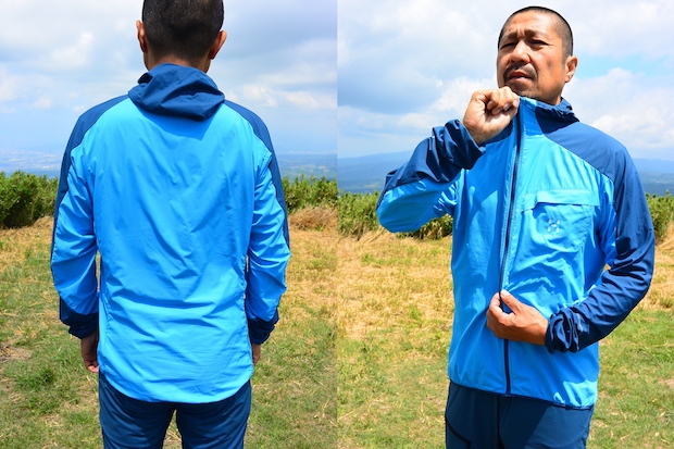左)背中の後ろ身頃から裾部分が長くなっていて、ザックを背負う時にパンツのベルト部分と干渉しない。かがんでも背中が出ない。右)フードは小さめだが、ジップをあげて着ていてもアタリが柔らかいので首回りが気にならない。