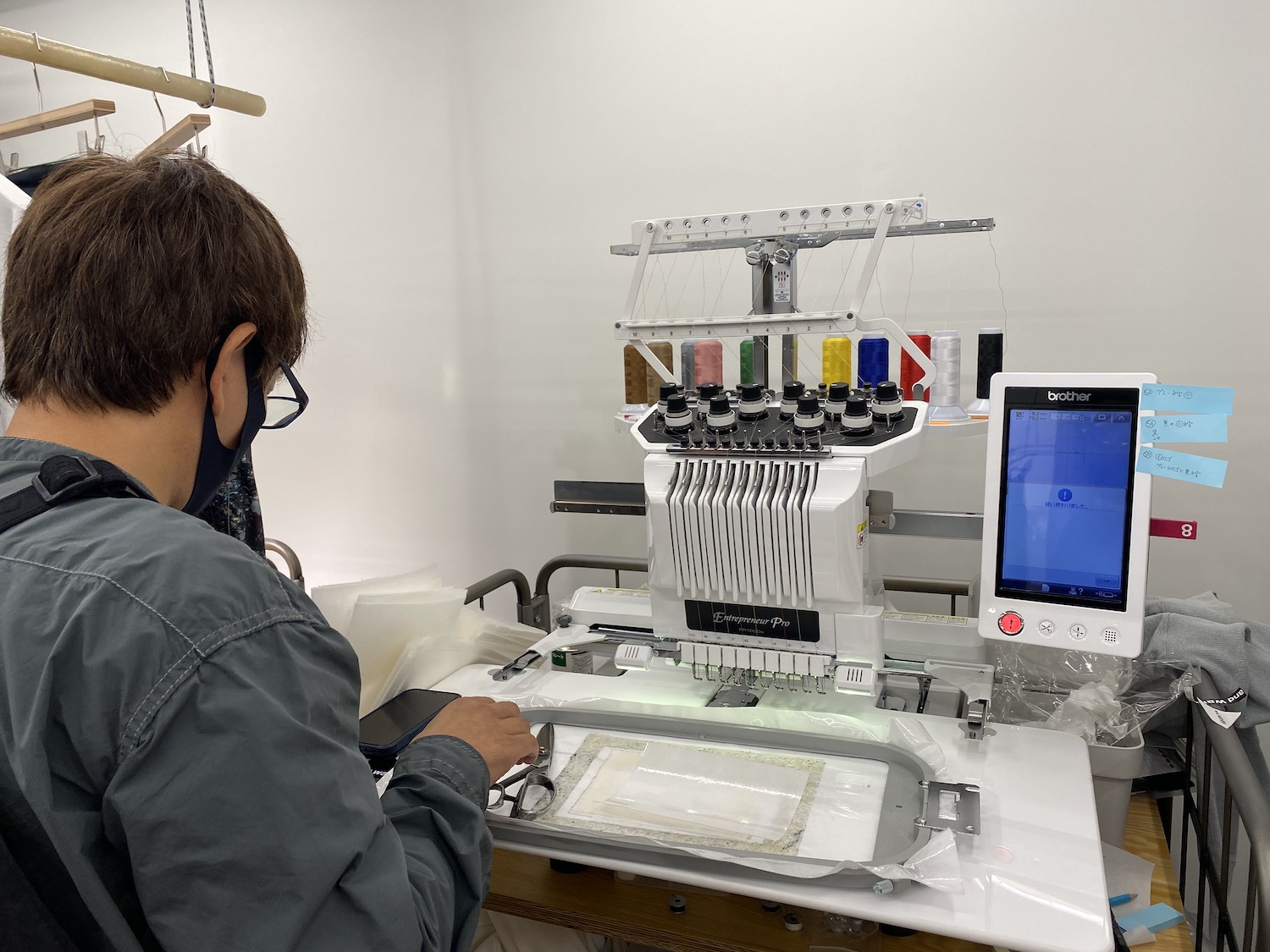 POP UP開催中は、and wanderのロゴなどの刺しゅうが行われている。