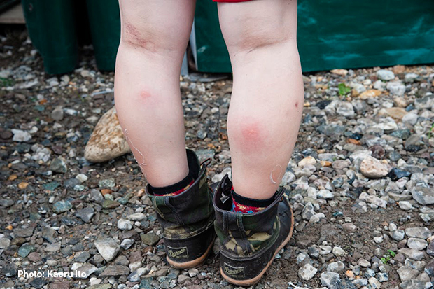 足首からふくらはぎ辺りが一番虫に食われやすい。長靴はぬかるみだけでなく虫除けにも有効