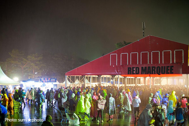 なにも常に登山のような装備で会場を歩き回る必要はありませんが、レインウェアはいつでも取り出せるようにバッグに入れて携行した方がよいです。万が一濡れてしまった場合は、できるだけ早く乾いた衣類に着替えるようにしましょう。気化熱で体温を奪われると真夏でも低体温症を引き起こすことがあります。熱中症にもご注意を。