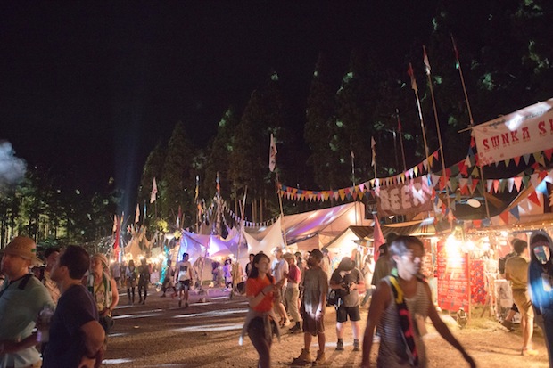 流木アートやアメリカンインディアンのティピなど。フィールドオブヘブンは出店者みずからがブースを制作し、そのためどのお店も強い個性に溢れる。素材にこだわった食や、地球にやさしい衣料品など、単一の村のように活気に満ちているエリアだ。