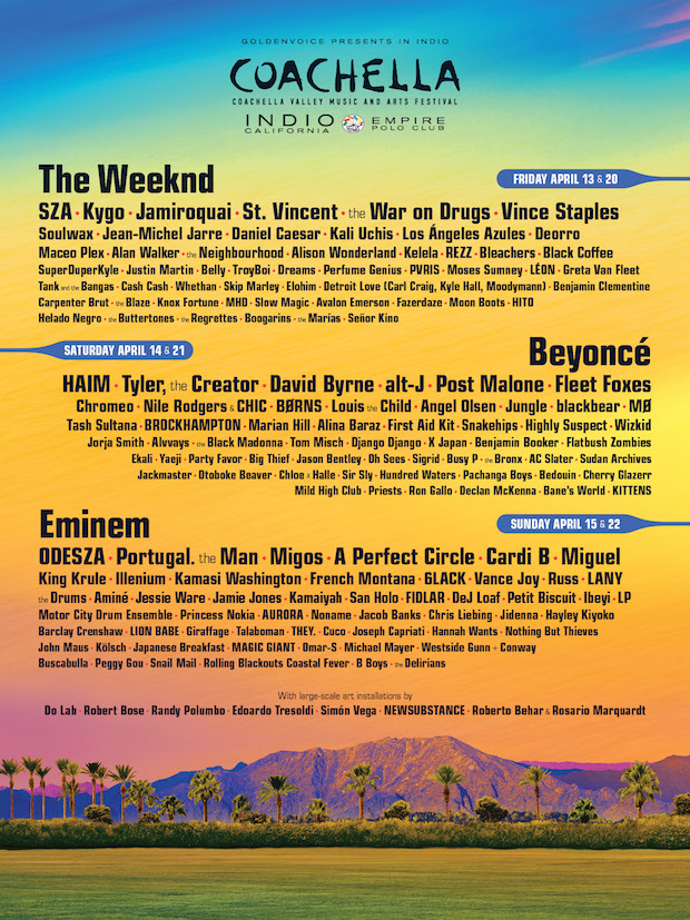 カリフォルニアで1999年にスタートした「コーチェラ・フェス」。今やイギリスのグラストンベリーと並んで、もっとも世界で人気を集めているビッグフェスだ。2012年から、連続する2週のウィークエンドを同じラインナップで開催するという、画期的な挑戦を行っている。別のラインナップであれば、例えば日本でもロックインジャパンがそうしているように他にも例があるけれど、まったく同じコンテンツというフェスは他に存在しない。2週連続にしても必ずファンを集められるという確信があったのだろうし、実際チケットはソールドアウトが続いている。THE WEEKEND、BEYONCE、EMINEMがヘッドライナーとして発表された今年のチケットも、発売直後にすべての種類が完売してしまった。
