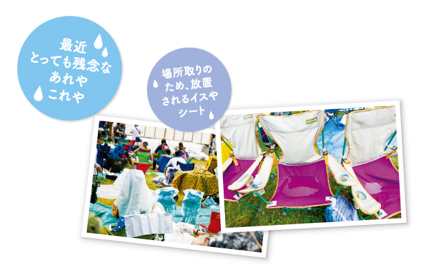 グリーンステージ後方のエリアには、広げたままのシートや誰も座っていないイスが、自分たち場所取りのために放置されている。