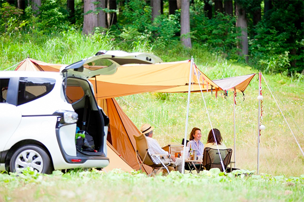 ピラミッドガーデンのさらに奥にある、ムーンキャラバンはクルマを駐車してのキャンプ、つまりオートキャンプが可能なエリアだ。木曜IN、月曜OUTの4泊での利用者のみとなっている。スペースに制限はあるがタープの使用も可能で、火器の使用も認められていて自炊も可能(直火はNG)。またこのエリア内であればペットと一緒に過ごすこともできる。
