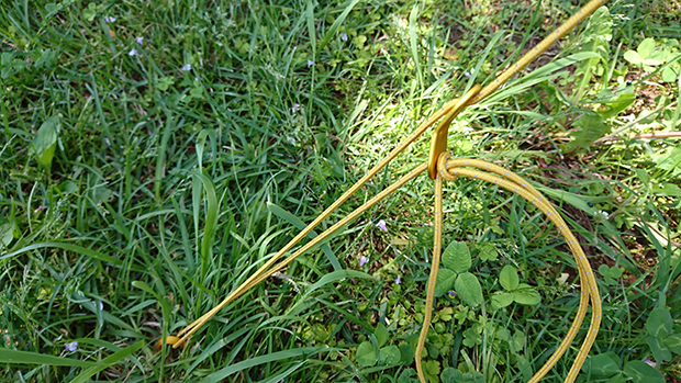 ロープを短くするには自在金具に留まっている側のロープの端を引き出して、片蝶結びなどで留め、自在金具の有効長を短くして使おう。