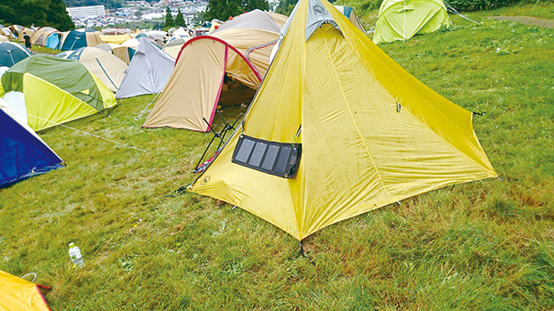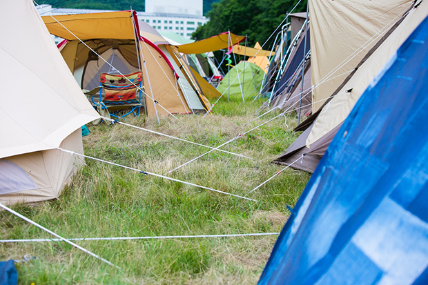 人気エリアともなると隣のテントと密着するほど隙間なくテントが張られる。するとテントを張るためのロープ(ガイライン)を引くことさえ難しい。とはいえテントにテンションをかけないと雨を弾かないし風にも弱い。狭い範囲でもテントをしっかり張るには、ロープの長さを短くして近い位置にペグを打つこと。